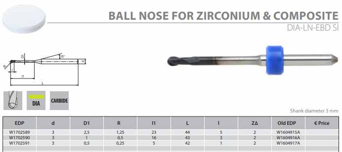 - Mũi cắt sứ zirconia & vật liệu tổng hợp composite làm từ hợp kim Carbide giúp mũi cắt luôn cứng cáp, cạnh cắt sắt bén, bền bĩ, phay với tốc độ cao